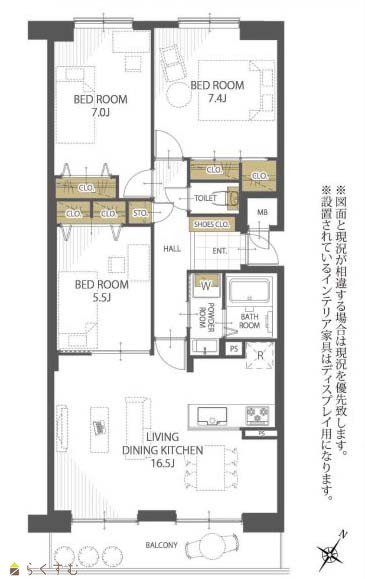 3LDK (洋室:7.4、7.0、5.5) LDK16.5 |