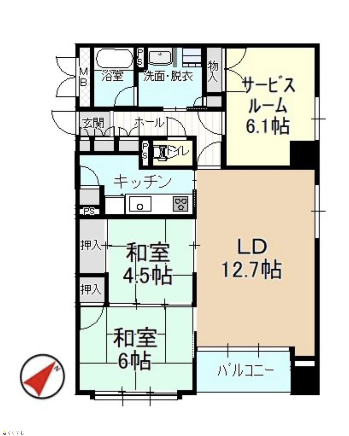 2LDK (和室:6畳、4.5畳) LD12.7 サービスルーム6.1帖 |