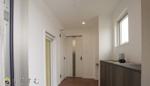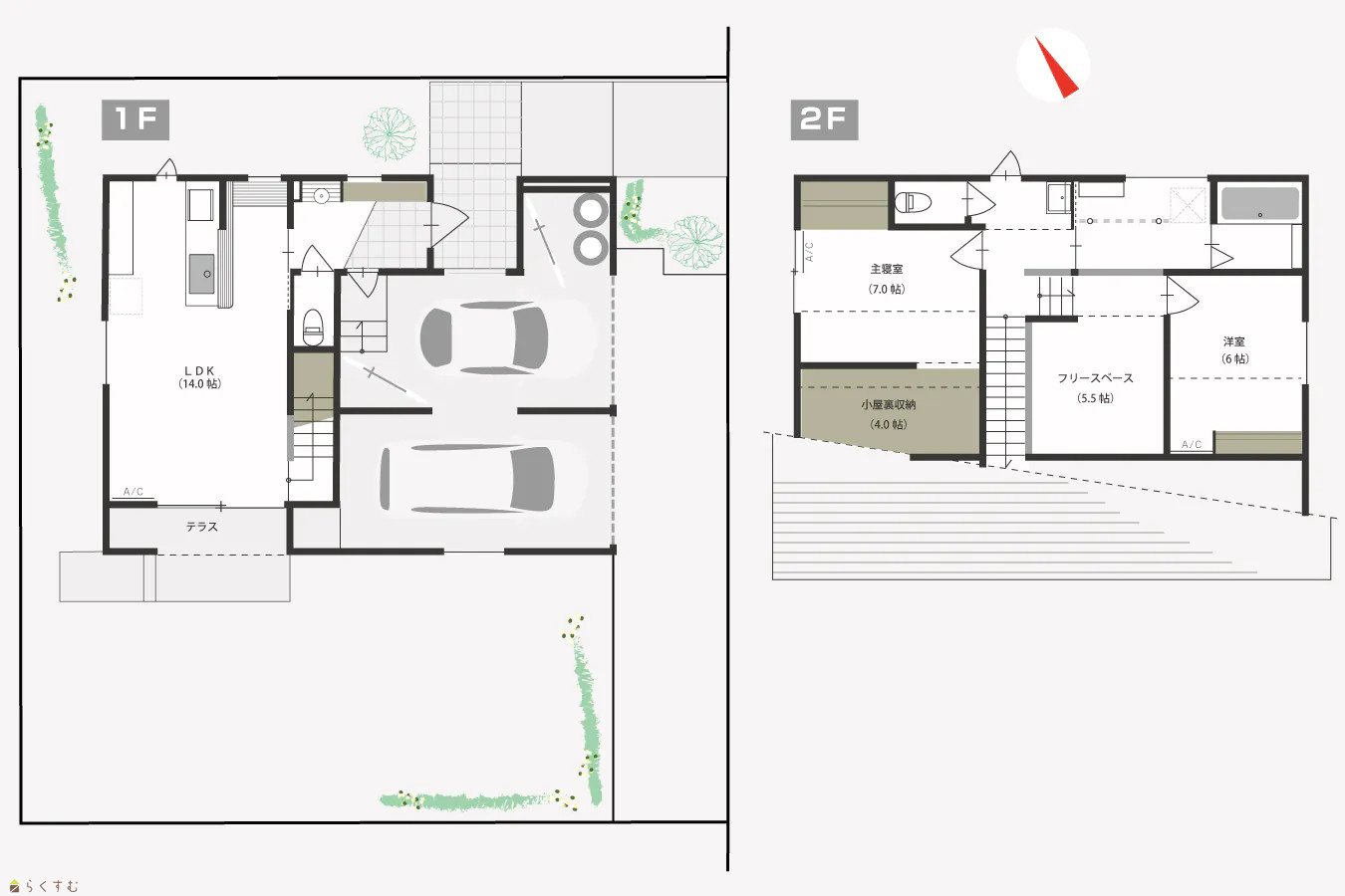 | 北から南へ、キッチン・ダイニング・リビングを一直線に配置し、その先には2.5m幅の掃き出し窓。屋根付きテラスが夏の日差しを遮り、適度な光と温もりが差し込む心地よいLDKです。自然と家族が集まる空間を目指して設計された住まい。2階に上がり、4段降りた先には5.5帖のフリースペースを設け、家族のセカンドリビングとして多彩に活用できます。カップボード・カーテン・エアコン3台付きで快適。4帖の小屋裏収納つき。ガレージにはタイヤやアウトドア用品などもたっぷり収納できます。 | |||