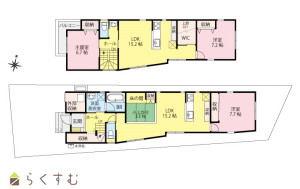 3LDK (洋室:7.7、7.2、6.7)、LDK18.7(小上がり畳部3.5帖含む)(1F) ・ LDK15.2(2F)、1階リビングに小上がりの畳スペース有り