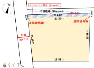 ・北側道路は2項道路の為、セットバック約23.64㎡を要す。