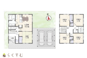 5LDK (和室:7.2畳) (洋室:6.3、6.3、5.5、5.5)、LDK14.5、ランドリースペース有