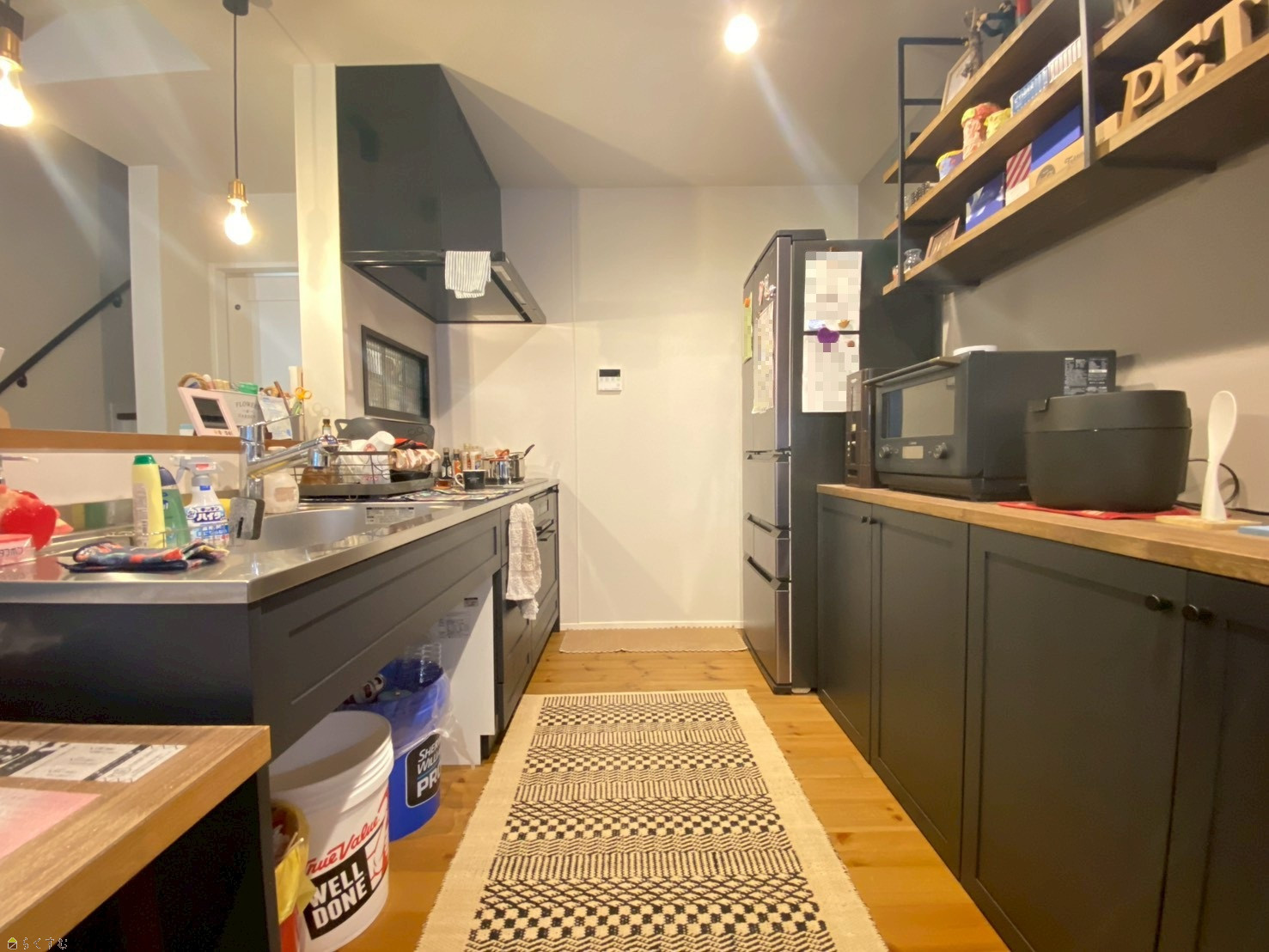 デザイン性と収納力を兼ね備えた黒×木目のキッチンスペース。